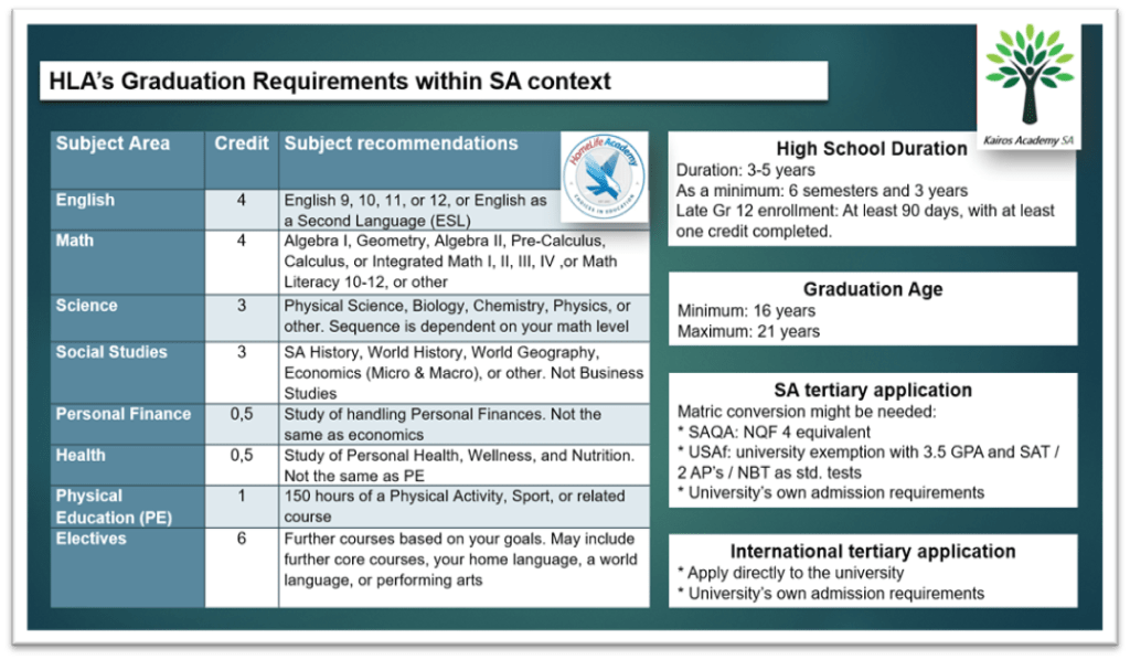 To graduate through Kairos Academy SA in partnership with HLA, students must be between 16 and 21 years old and fulfill all academic and credit requirements: